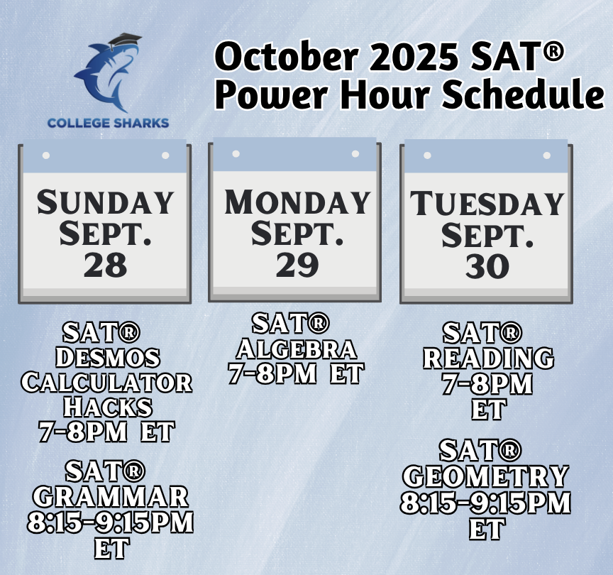 SAT® Power Hours SAT® Power Hours are optimal for students who…Are testing in the near futureStruggle with particular content areasWant to learn the most high-yield content and strategies for particular content areas What’s covered in our ENGLISH Power Hours? What’s covered in our MATH Power Hours? *OCTOBER* 2025 Power Hour Schedule Registration Live SAT® Power Hours Sale Live SAT® Power Hours [*ENGLISH* Bundle] Sale Price: $180.00 Original Price: $200.00 Add to cart Sale Live SAT® Power Hours [*ALL FIVE* Bundle] Sale Price: $420.00 Original Price: $500.00 Add to cart Sale Live SAT® Power Hours [*MATH* Bundle] Sale Price: $260.00 Original Price: $300.00 Add to cart Power Hour Bundles (save $$) Live SAT® Grammar Power Hour $100.00 Add to cart Individual Power Hours Live SAT® Reading Power Hour $100.00 Add to cart Live SAT® Desmos Hacks Power Hour $100.00 Add to cart Live SAT® Algebra Power Hour $100.00 Add to cart Live SAT® Geometry Power Hour $100.00 Add to cart Recorded SAT® Power Hours Power Hour Bundles (save $$) Sale Recorded SAT® Power Hours [*ALL FIVE* Bundle] Sale Price: $420.00 Original Price: $500.00 Add to cart Sale Recoded SAT® Power Hours [*ENGLISH* Bundle] Sale Price: $180.00 Original Price: $200.00 Add to cart Individual Power Hours Sale Recorded SAT® Power Hours [*MATH* Bundle] Sale Price: $260.00 Original Price: $300.00 Add to cart Recorded SAT® Algebra Power Hour $100.00 Add to cart Recorded SAT® Grammar Power Hour $100.00 Add to cart Recorded SAT® Reading Power Hour $100.00 Add to cart Recorded SAT® Geometry Power Hour $100.00 Add to cart Recorded SAT® Desmos Calculator Hacks Power Hour $100.00 Add to cart