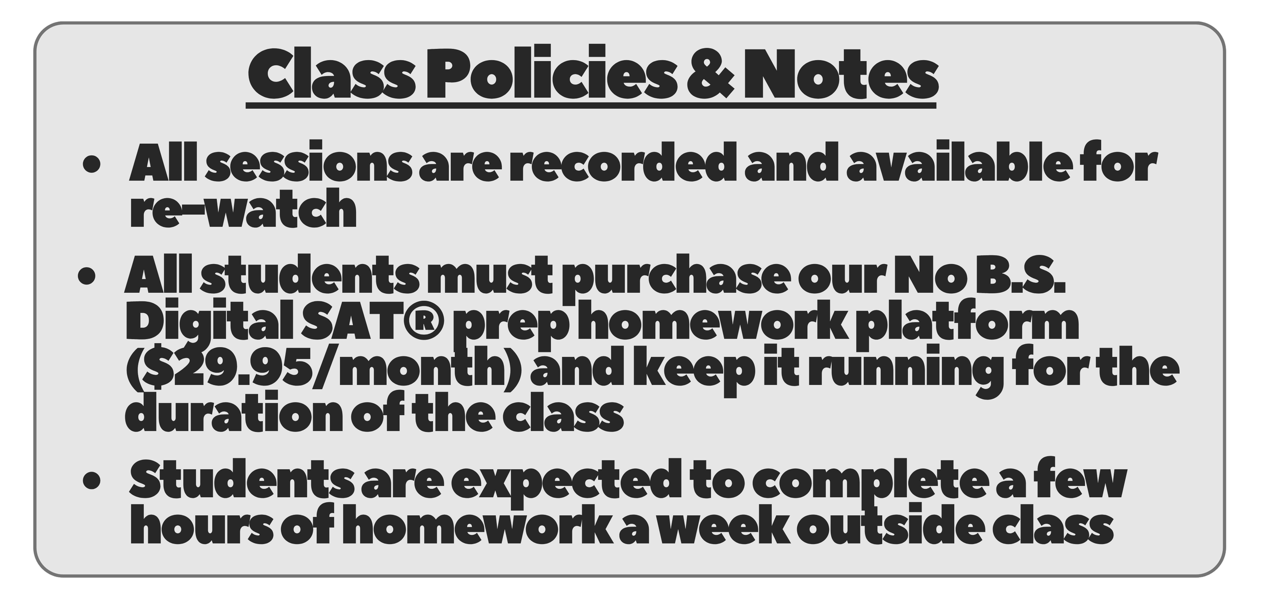 A thorough review of the SAT®’s highest yield content, spanning reading, grammar, transition words, pre-algebra, Algebra 1, Geometry & Algebra 2, and Desmos.