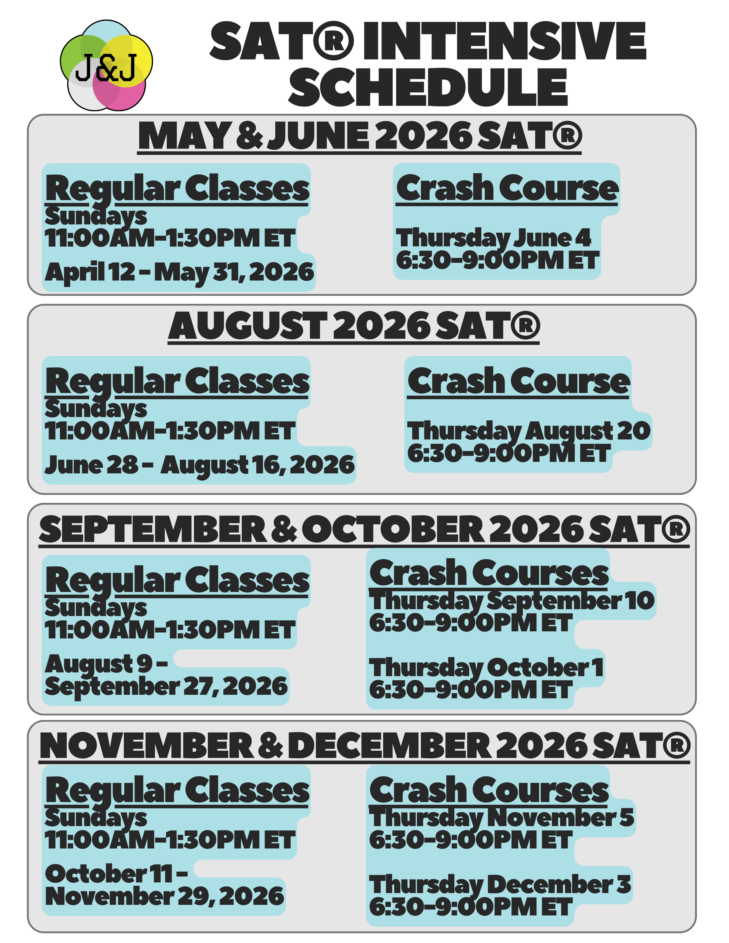 A thorough review of the SAT®’s highest yield content, spanning reading, grammar, transition words, pre-algebra, Algebra 1, Geometry & Algebra 2, and Desmos.