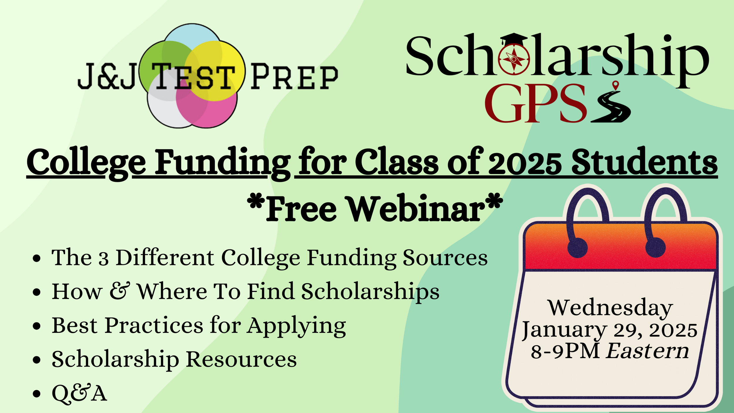 Scholarship GPS Free Webinar Registration Register Here: Parent Name * First Name Last Name Student Name * First Name Last Name Parent Email * Please ensure this is entered correctly, as we will send class information here. Student Email * Please ensure this is entered correctly, as we will send class information here. Student Graduation Year * 2024 2025 2026 2027 2028 2029 2030 Other Thank you for submitting your form!We will send an email as well, but in case you would like to copy it, here is the webinar Zoom information: https://us02web.zoom.us/j/81725867869?pwd=CJQO5jKV4xZb00GrgPBMzBT6qNdPrT.1Meeting ID: 817 2586 7869Passcode: JJTESTPREP